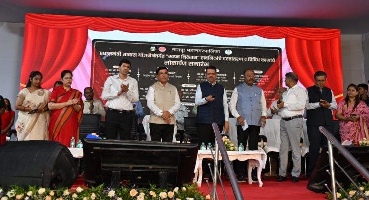 नागपूर महानगरपालिकेतर्फे प्रधानमंत्री आवास योजना अंतर्गत मौजा वांजरा येथील जागेवर बांधण्यात आलेले 480 सदनिकांचे हस्तांतरण व विविध विकास कामांचे लोकार्पण आज करण्यात आले. मुख्यमंत्री देवेंद्र फडणवीस यांच्या हस्ते आणि महसूल मंत्री तथा पालकमंत्री चंद्रशेखर बावनकुळे व वित्त राज्यमंत्री ॲड. आशिष जयस्वाल यांच्या उपस्थितीत प्रातिनिधिक स्वरूपात लाभार्थ्यांना सदनिकांच्या किल्ली सुपूर्द करण्यात आल्या.