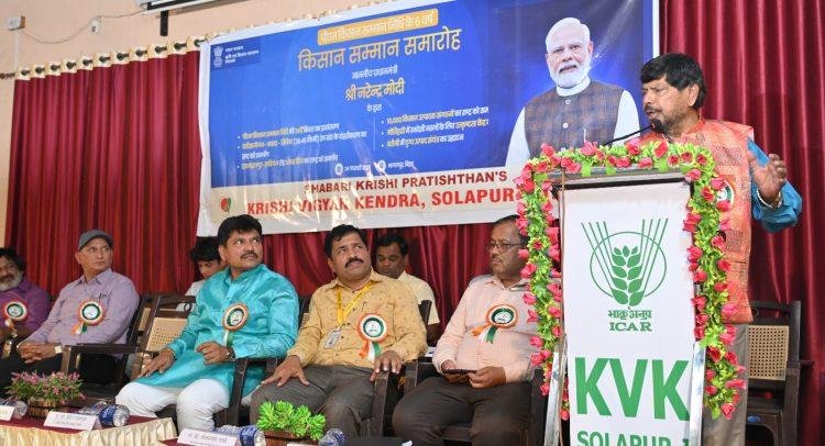 सोलापूर, 25:- शेतकऱ्यांच्या उन्नतीसाठी केंद्र सरकार कटीबद्ध आहे. सर्वसामान्य जनतेला सामाजिक न्याय देणे शेतकऱ्याचे कल्याण करण्यासाठी केंद्र सरकार प्राथमिकता देत आहे. महिला शेतकऱ्यांची उपस्थिती त्यांचे अधिक योगदान असल्याचे दर्शवते असे प्रतिपादन केंद्र शासनाच्या सामाजिक न्याय व सक्षमीकरण मंत्रालयाचे राज्यमंत्री रामदास आठवले यांनी केले. ते शबरी कृषी प्रतिष्ठान सोलापूर संचलित कृषी विज्ञान केंद्र सोलापूर येथे आयोजित किसान सन्मान समारोह कार्यक्रमांमध्ये बोलत होते.