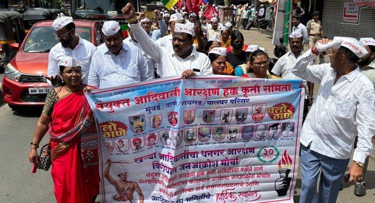 ठाणे 30 – राज्य सरकारने धनगर समाजाला आदिवासी प्रवर्गात म्हणजेच अनुसूचित जमातीअंतर्गत आरक्षण देण्यासाठी समिती गठीत केली आहे. त्या निषेधार्थ तसेच अनुसूचित जमाती प्रवर्गात धनगरांचा समावेश करू नये, या मागणीसाठी सोमवारी संयुक्त आदिवासी आरक्षण हक्क कृती समितीच्या वतीने ठाणे जिल्हाधिकारी कार्यालयावर मोर्चा काढण्यात आला. यावेळेस, धनगर समाजाला आदिवासी जमातींमध्ये समाविष्ट करून बेरजेचे राजकारण कराल तर आम्ही 85 मतदारसंघात वजाबाकीचे राजकारण करू, असा इशारा संयुक्त आदिवासी आरक्षण हक्क कृती समितीचे निमंत्रक अनिल भांगले, सुनील झडके आणि हंसराज खेवरा यांनी दिला.