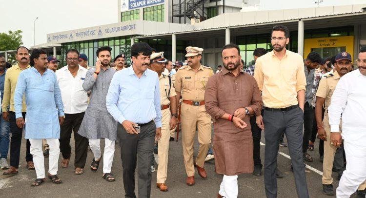 सोलापूर, 11 :- सोलापूर विमानतळ येथून सोलापूर ते गोवा या विमानसेवेचा शुभारंभ सोमवार दिनांक 9 जून 2025 रोजी मुख्यमंत्री देवेंद्र फडणवीस यांच्या हस्ते होणार आहे. विमानतळ परिसरात जवळपास दीड हजार नागरिकांसाठी उभारण्यात आलेल्या शामियानाची तसेच धावपट्टी व विमानतळाची पाहणी पालकमंत्री जयकुमार गोरे यांनी करून संबंधित यंत्रणाना कार्यक्रम यशस्वीतेसाठी मार्गदर्शक सूचना दिल्या.