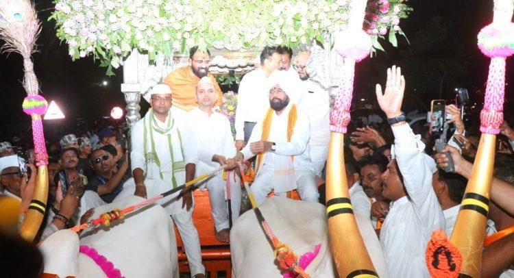 जळगाव, 11 – राज्याचे उपमुख्यमंत्री एकनाथ शिंदे यांनी आज मुक्ताईनगर येथील कोथळी गावातील संत मुक्ताबाई मंदिरात जाऊन दर्शन घेतले. यानंतर पंढरपूरकडे प्रस्थान करणाऱ्या संत मुक्ताबाई पालखी सोहळ्याचा शुभारंभ करत त्यांनी पालखीचे पूजन केले आणि स्वतः पालखीचे सारथ्य करून या ऐतिहासिक अध्यात्मिक परंपरेत सहभाग घेतला.यावेळी त्यांच्या समवेत राज्याचे जलसंपदा मंत्री गिरीश महाजन, जळगाव जिल्ह्याचे पालकमंत्री गुलाबराव पाटील होते.