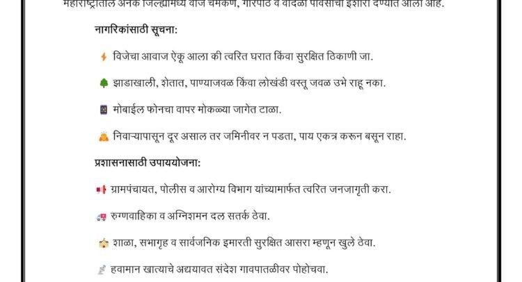 हवामान खात्याने दिलेल्या सूचनांनुसार, विजेचा कडकडाट ऐकू आला की तात्काळ घरात किंवा सुरक्षित ठिकाणी आश्रय घ्यावा. झाडाखाली, शेतात, पाण्याजवळ किंवा लोखंडी वस्तूंच्या जवळ उभे राहणे टाळावे. मोकळ्या जागेत मोबाईल फोनचा वापर करू नये. तसेच निवाऱ्यापासून दूर असल्यास जमिनीवर न पडता पाय एकत्र करून बसून राहावे, असेही सांगण्यात आले आहे.