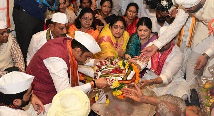 पुणे, 19: मुख्यमंत्री देवेंद्र फडणवीस यांनी आज श्री क्षेत्र देहू येथील जगद्गुरु श्री संत तुकाराम महाराज संस्थान मंदिरात श्री विठ्ठल रखुमाई मंदिर आणि श्री संत तुकाराम महाराज शिळा मंदिर आणि श्रीराम मंदिरात दर्शन घेतले. त्यांच्या हस्ते मंदिरात श्री गणेश पूजन, कलश पूजन, पाद्य पूजन करून पालखीची विधिवत प्रस्थान पूजा व आरती झाली.