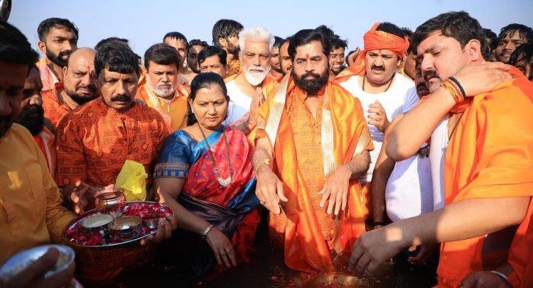 प्रयागराज, 25 – उत्तर प्रदेशातील प्रयागराज येथे सोमवारी राज्याचे उपमुख्यमंत्री एकनाथ शिंदे यांनी पत्नी सौ. लता शिंदे यांच्यासह महाकुंभ मेळाव्यात शाही स्नान केले. यावेळी मंत्री उदय सामंत, मंत्री दादा भुसे आणि मंत्री भरत गोगावले, मंत्री गुलाबराव पाटील यांनीही शाही स्नान केले. यावेळी उपमुख्यमंत्री एकनाथ शिंदे यांनी पत्रकारांशी संवाद साधला.