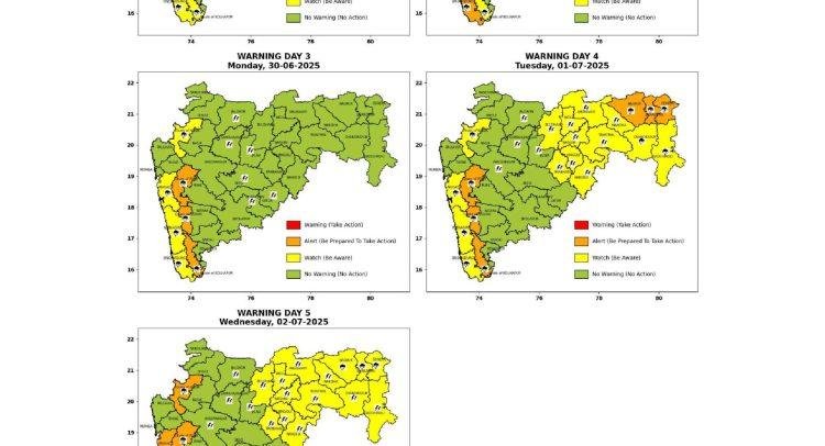 मुंबई, 30 : राज्यात पुढील 24 तासात रायगड, रत्नागिरी, सिंधुदुर्ग जिल्ह्यांसह पुणे घाट आणि सातारा घाट परिसरात ऑरेंज अलर्ट देण्यात आला आहे. तसेच भारतीय राष्ट्रीय महासागर माहिती सेवा केंद्र (आय.एन.सी.ओ.आय.एस.) तर्फे कोकण किनारपट्टीला 30 जून 2025 रोजी 11.30 पर्यंत 3.4 ते 4.9 मीटर उंच लाटांचा इशारा देण्यात आला आहे. या कालावधीत लहान होड्यांना समुद्रात न जाण्याच्या सूचना देण्यात आल्या आहेत, असे राज्य आपत्कालीन कार्य केंद्राने कळविले आहे.