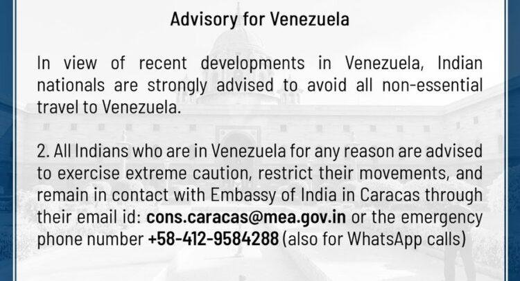 व्हेनेझुएलातील तणावाच्या पार्श्वभूमीवर भारत सरकारची ‘ट्रॅव्हल ॲडव्हायझरी’
