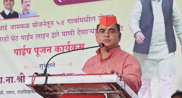बेटावद (ता. शिंदखेडा) येथे सुलवाडे-जामफळ योजनेअंतर्गत 54 गावांतील शेतांना थेट पाईपलाईनद्वारे पाणी पुरवठा करणाऱ्या योजनेच्या जलवाहिनी पूजन सोहळ्यात ते बोलत होते. यावेळी माजी सभापती श्रीमती संजीवणी सिसोदे, धुळे पाटबंधारे प्रकल्प मंडळाचे कार्यकारी अभियंता संदीप सोनवणे, सुलवाडे जामफळ कनोली उपसा सिचंन विभागाचे कार्यकारी अभियंता संदीप पवार, सहाय्यक अभियंता विशाल खैरनार, पदाधिकारी तसेच ग्रामस्थ मोठ्या संख्येने उपस्थित होते.