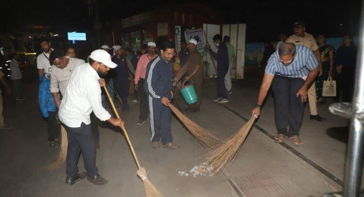 ठाणे (05) : ठाणे महानगरपालिकेच्या वतीने रेल्वे स्थानक परिसरात भव्य ‘डीप क्लीन ड्राइव्ह’ घेण्यात आला. आगामी स्वच्छ सर्वेक्षणच्या पार्श्वभूमीवर महापालिका आयुक्त सौरभ राव यांच्या मार्गदर्शनाखाली ही विशेष स्वच्छता मोहीम राबविण्यात येत आहे. शुक्रवारी रात्री राबविण्यात आल्यामुळे शनिवारी पहाटे रेल्वेस्थानकामध्ये प्रवेश केलेल्या प्रवाशांनी परिसर स्वच्छतेबाबत ठाणे महापालिकेचे कौतुक केले.